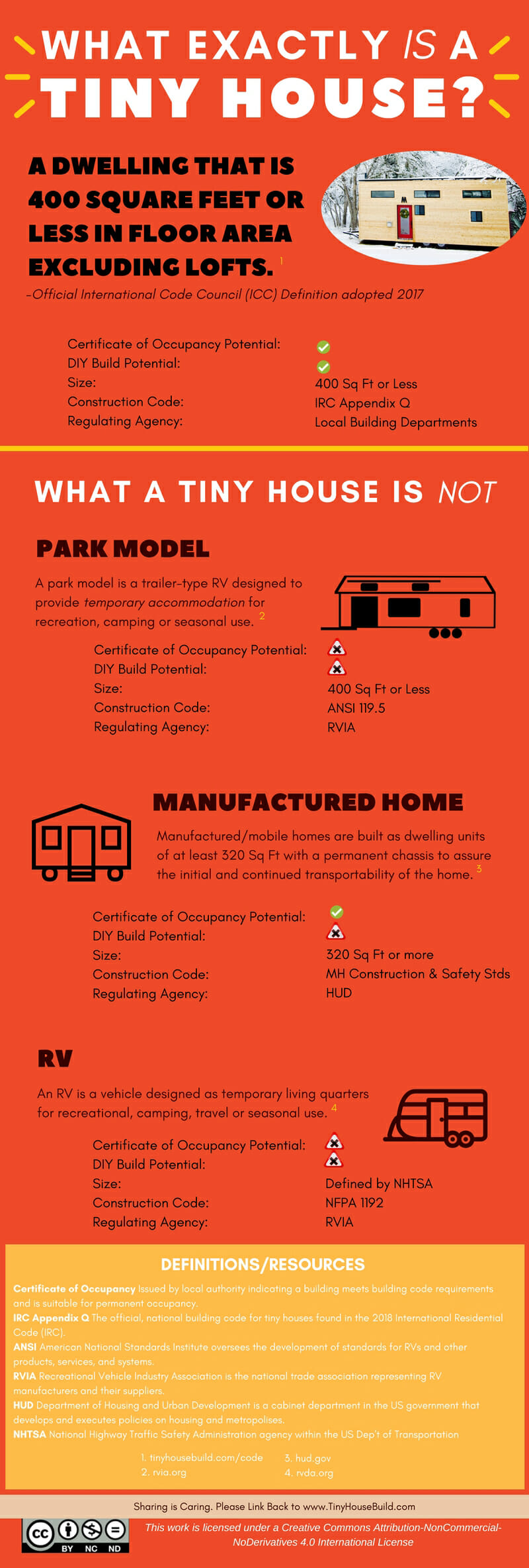 Like RV motor homes, travel trailers and fifth-wheel trailers, park model RVs are built to ensure safety but are not required to meet the building codes or installation codes that site-built or manufactured homes are required to meet. They are designed to remain on their axles and wheels, ready for movement and are not connected to the ground by footers, foundations, or columns (some local units of government do require them to be anchored due to excessive local winds, but even then they can easily be detached in minutes with only hand tools).